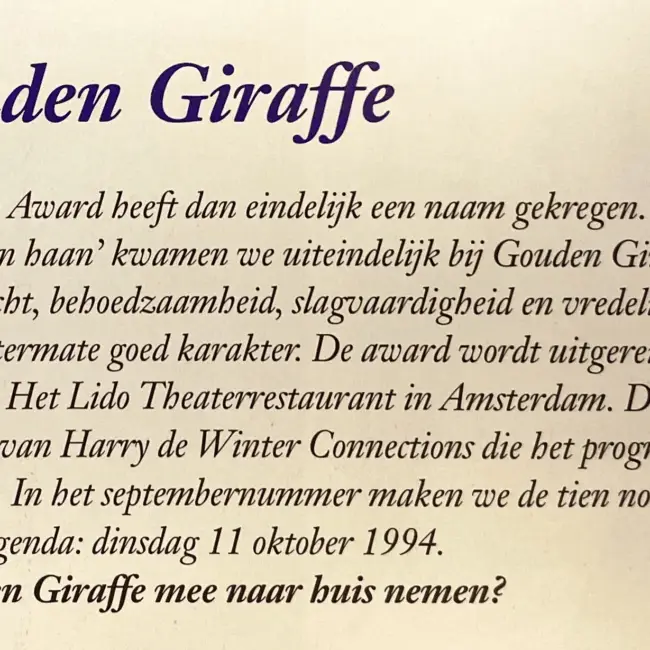 Begin 1994 ziet een nieuw vakblad het levenslicht: Event&Image. Bij de lancering wordt al direct een Event&Image Award voor het einde van dat jaar aangekondigd. In de tussenliggende maanden gaan alternatieve namen als het ‘Gouden Biggetje’ en de ‘Gouden Haan’ nog rond, maar bij de aankondiging van het uitreikingsevent wordt de definitieve en nog altijd geldende naam bekendgemaakt: de Gouden Giraffe. Het is een dier met een uitermate goed karakter, geeft de redactie als onderbouwing: overzicht, behoedzaam, slagvaardig en vredelievend.