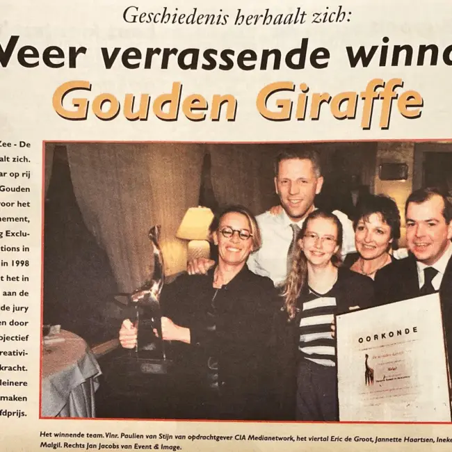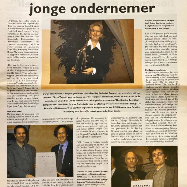 Tijdens de derde uitreiking van de Gouden Giraffe Awards, dit keer in hotel-restaurant ’t Jagershuis in Ouderkerk aan de Amstel, gaat een nog jonge onderneemster (24) – als Dikkertje Dap’ zoals ze het zelf duidt – er met de hoofdprijs vandoor. Sabine Geerling van Geerling Exclusive Events in Leiden organiseerde met Circus Talent in opdracht van TNT Worldwide Events volgens de jury het beste relatie-evenement van het afgelopen jaar. Eervolle vermeldingen zijn er voor DOL Drama Op Locatie voor ‘The Roaring Experience’ voor de afdeling intensive care van het Rotterdamse Dijkzigt Ziekenhuis en voor REM Bureau voor Relatiemarketing die voor opdrachtgever Avéro Verzekeringen de klantenreis ‘The Scottish Experience’ organiseerde.