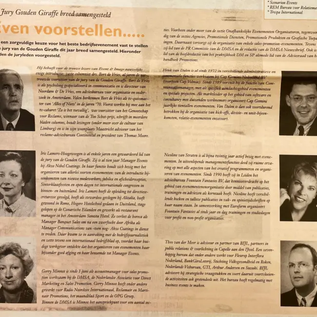 Onder de nominaties voor de Gouden Giraffe 1998 bevindt zich een primeur, schrijft Event&Image met een uitroepteken. Voor het eerst heeft een opdrachtgever een campagne ingezonden: Trespa, producent van gevelbekleding, met haar evenementenreeks Trespa means business. Deze case gaat uiteindelijk naar huis met een oorkonde voor de tweede plaats. Een update over de samenstelling van de jury. Naast juryvoorzitter van het eerste uur Bert de Vries en jurylid van het eerste uur Iris Lamers – Hoogewegen, zien we Henk van Dalen (Cap Gemini), Gerry Minnee (branchevereniging DSMA), Nicoline van Straten (Adviesbureau Fountain Fantasies) en Theo van der Meer (BIJL, partners in public relations & voorlichting).