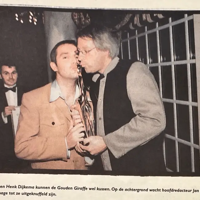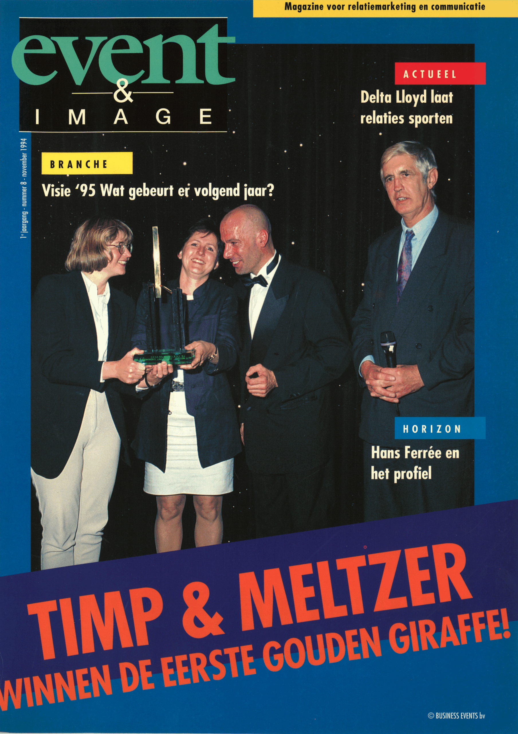 Timp&Meltzer Kommunikatie Produkties is de eerste winnaar van de Gouden Giraffe met de motivatiebijeenkomst die zij organiseerden voor Gall&Gall. Amber Timp en Hermien Meltzer nemen het beeld gierend van de lach in ontvangst, zo lezen we in het verslag van de avond. Ook is er een zilveren variant voor Captijn&Heidinga (voor Levobia, een bedrijfsmusical voor Levob Verzekeringen) en als ‘aanmoedigingsprijs’ de Bronzen Giraffe voor Drama op Lokatie (Koningsspel voor Bank of America). We leren op die avond ook de ontwerper van het eerste Gouden Giraffe beeld kennen: kunstenaar Henny Kuilman.