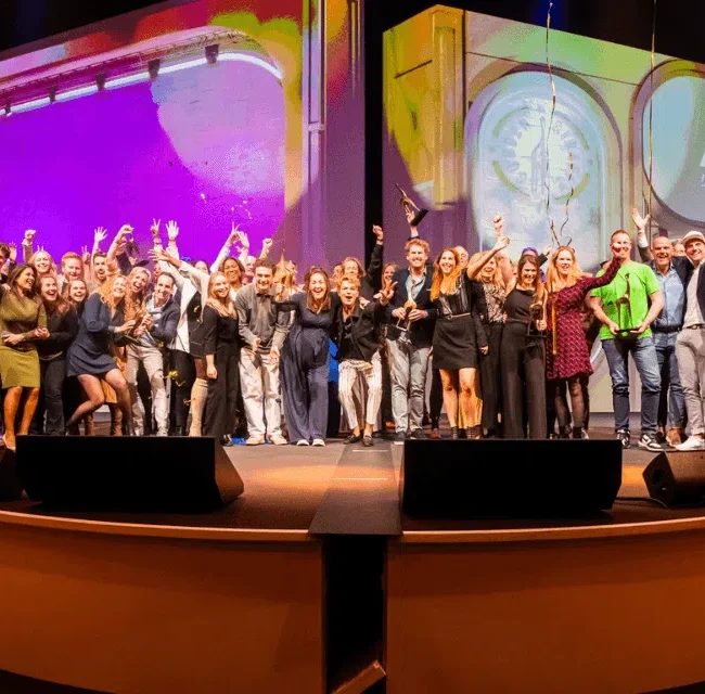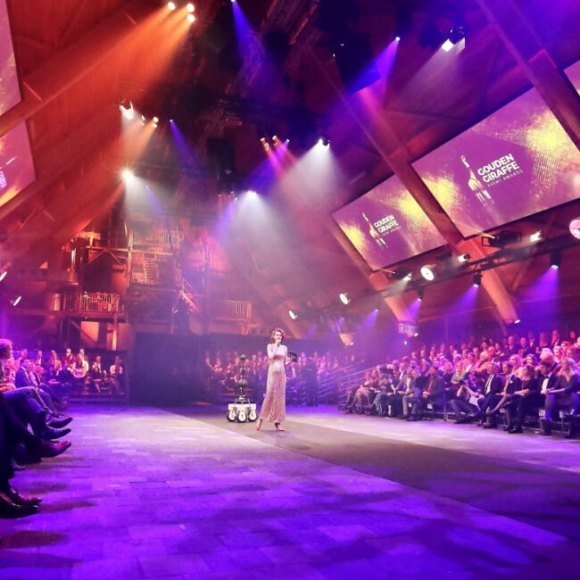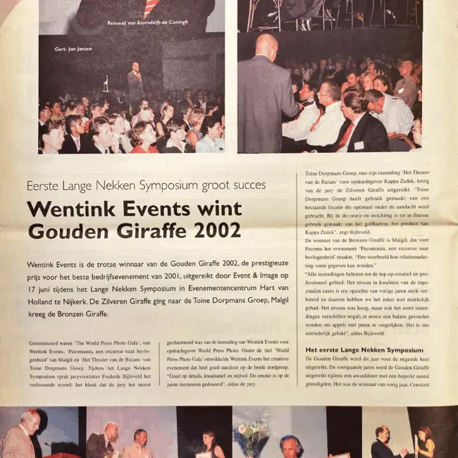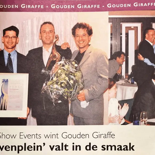 Laten we beginnen met de nieuwe Gouden Giraffe voor het bijzondere evenement. Die gaat tijdens de uitreiking in de Efteling naar Theo Events Artists Catering vanwege het openingsevenement voor Cultuur Onder Dak Apeldoorn (CODA). En vanaf nu dus twee Gouden, Zilveren en Bronzen Giraffen. In de categorie Zakelijk gaan deze naar B&S*) Leads voor de ‘Duyvis Pastrelli Relli’ en in de categorie Vermakelijk naar Toine Dorpmans Groep voor Coca-Cola in beweging. De Zilveren Giraffen zijn voor Bureau van Harten die de ‘Grand Opening’ verzorgde van het kantoor van Sanoma Uitgevers (categorie Zakelijk) en COR Events die voor Rabobank Almere het ‘Open vizier naar de toekomst’ organiseerde (categorie Vermakelijk). De Bronzen Giraffe Zakelijk is voor Robert J. Reinders Architecten van Applaus met ‘100 jaar mensenwerk’ voor Vos Groep Oldenzaal. Marc van Laere Producties in samenwerking met Make in Mind maakt het podium compleet met de Bronzen Giraffe Vermakelijk met ‘Brake Event - Partnership more than only brakes’ voor All Brake Systems.