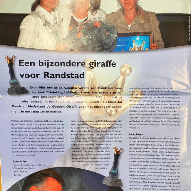 De Gouden Giraffe ‘het bijzondere event’ gaat naar Randstad Nederland voor het zelf georganiseerde Supportschool Athene, waarmee ze 2.500 beslissers in contact werden gebracht met de Olympische Spelen zonder af te reizen naar Athene. Voorzitter René Waerts benadrukt nog dat de prijzen van origine bedoeld zijn voor bureaus en niet voor opdrachtgevers en dat deze categorie een mooie ontsnapping is om een uitzonderlijk evenement als dit toch te belonen.